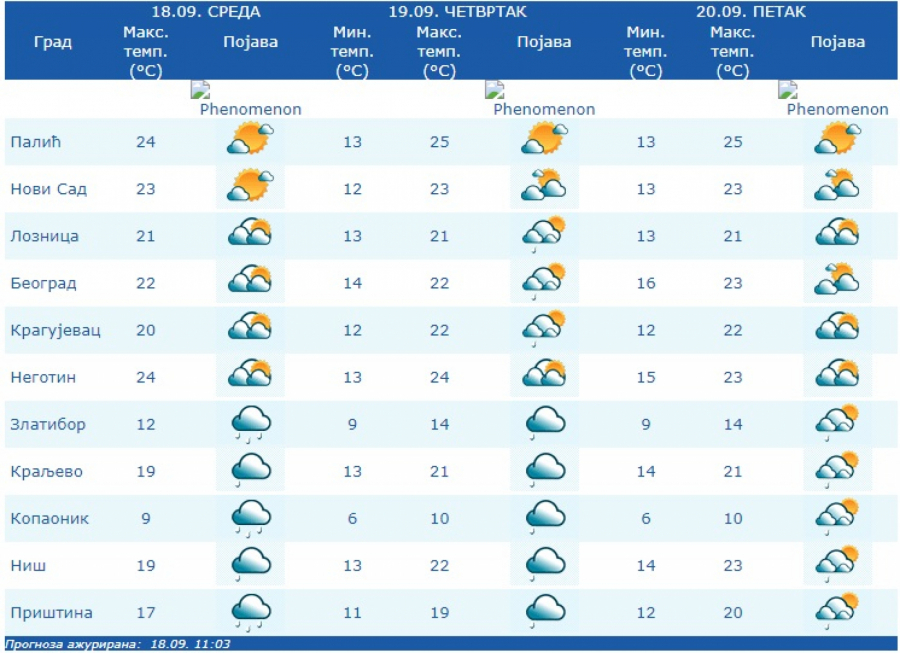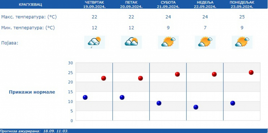 Pre podne s kišom i lokalnim pljuskovima u jugozapadnim, južnim i jugoistočnim, a posle podne mestimično i u zapadnim, centralnim i istočnim predelima Srbije i najvišom dnevnom temperaturom do 25 stepeni.