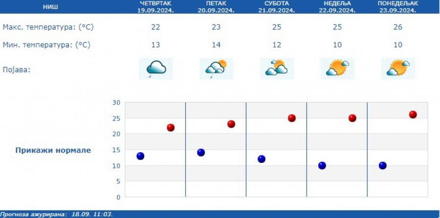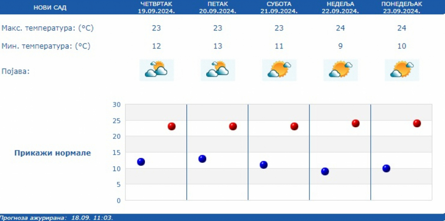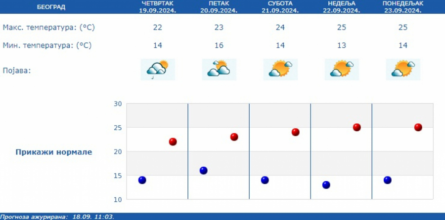 Prema prognozi Republičkog hidrometeorološkog zavoda, najniža temperatura iznosiće od 9 do 14, najviša dnevna od 19 do 22 stepena, na severu Vojvodine i do 25 stepeni.