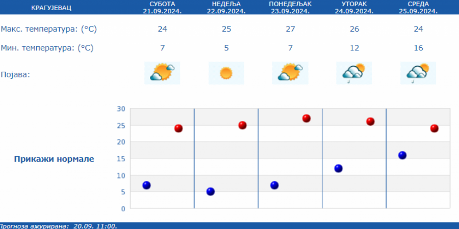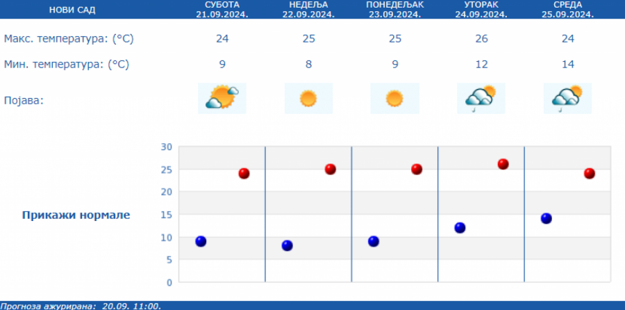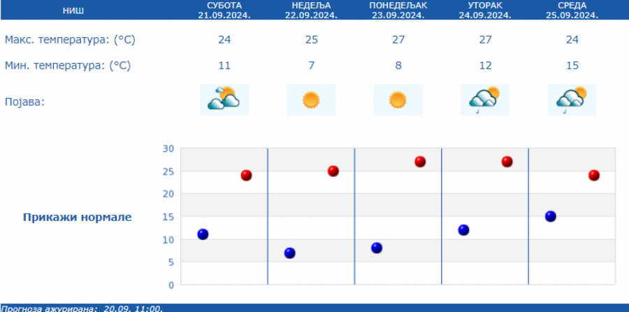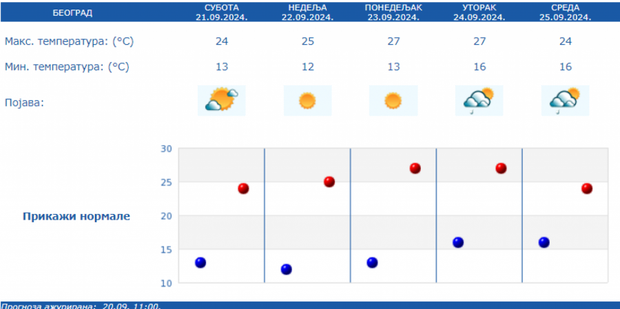 Najniža temperatura od 10 do 13, najviša oko 24 stepena Celzijusa.