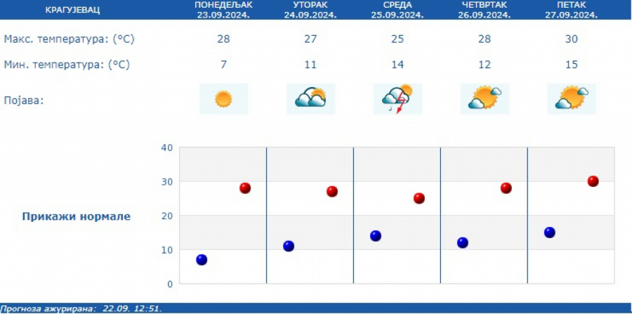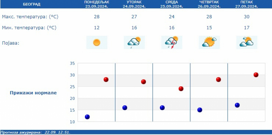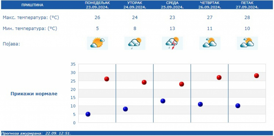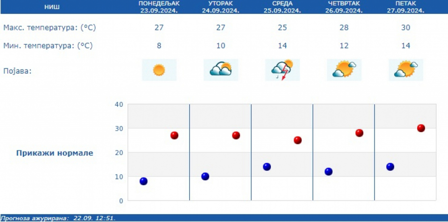 Tokom dana pretežno sunčano i toplo za ovaj period godine, s najvišom dnevnom temperaturom od 25 do 28 stepeni.