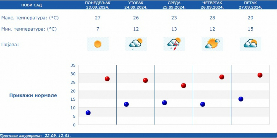 Vetar slab do umeren, istočni i jugoistočni, krajem dana u košavskom području u pojačanju. Najniža temperatura od 3 do 12 °C, a najviša dnevna od 25 do 28 °C.
