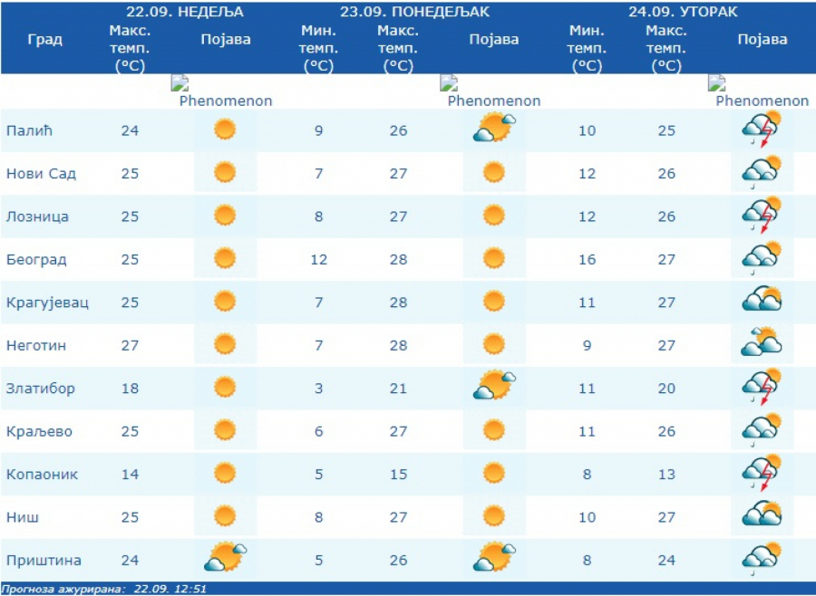 Prema prognozi Republičkog hidrometeorološkog zavoda (RHMZ), ujutru po kotlinama, dolinama reka i visoravnima zapadne, jugozapadne i južne Srbije mestimično magla.