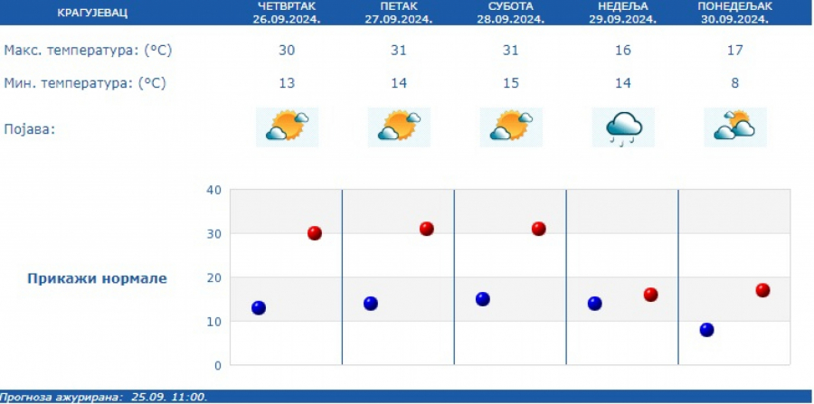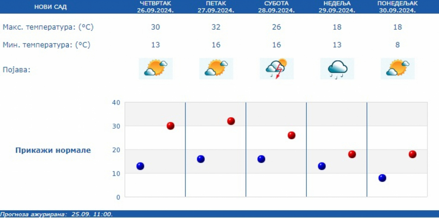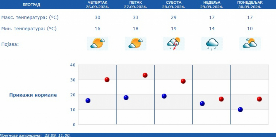 U narednim danima, najtopliji dan ove nedelje biće petak, sa maksimalnom temperaturom do 33 stepena, dok se od subote najpre u Vojvodini a potom i u Zapadnoj Srbiji očekuje zahlađenje sa kišom i grmljavinom.