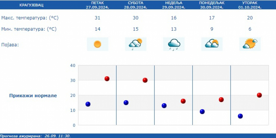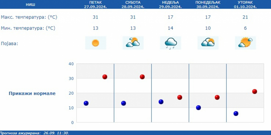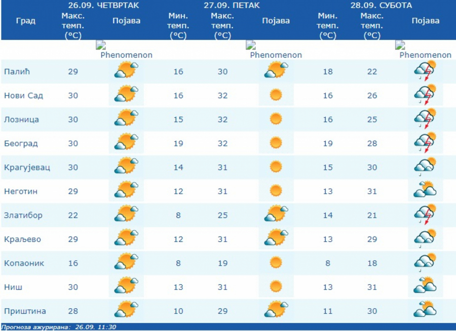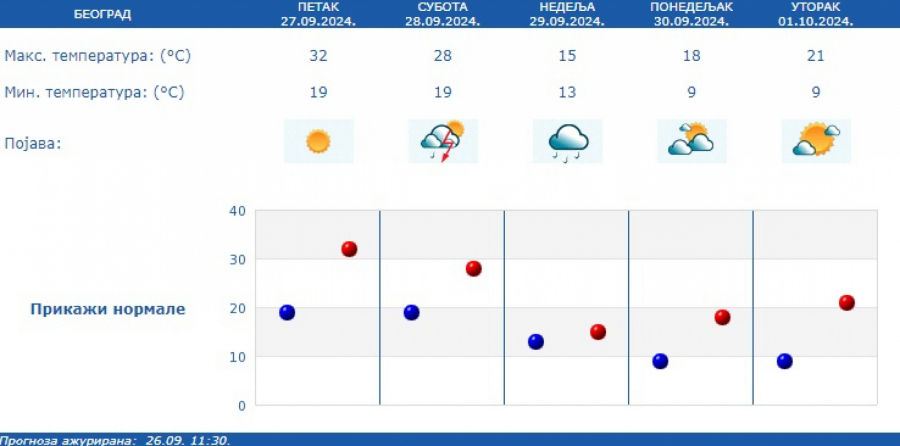 Tada se očekuje i maksimalna temperatura od 22 stepena na krajnjem severu do 32 stepena na jugoistoku zemlje, a naoblačenje s kišom će se u nedelju proširiti i na ostale krajeve uz značajan pad temperature, u proseku za 10 do 15 stepeni i sa jakim severnim i severozapadnim vetrom, ponegde i sa udarima olujne jačine.