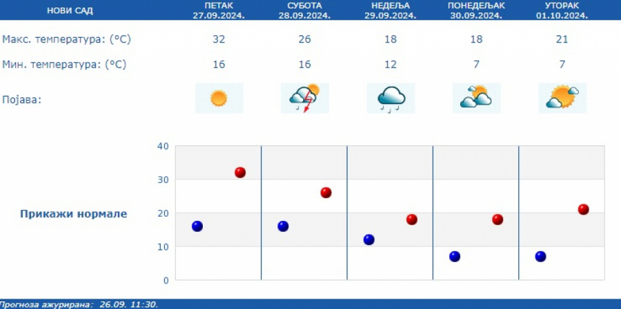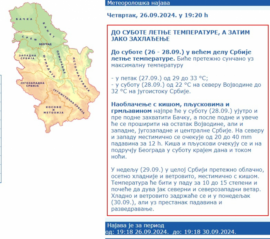 Od subote se očekuje naoblačenje sa kišom, pljuskovima i grmljavinom, najpre u Bačkoj, a do kraja dana postepeno i u ostalim krajevima Vojvodine, ali i zapadne, jugozapadne i centralne Srbije.