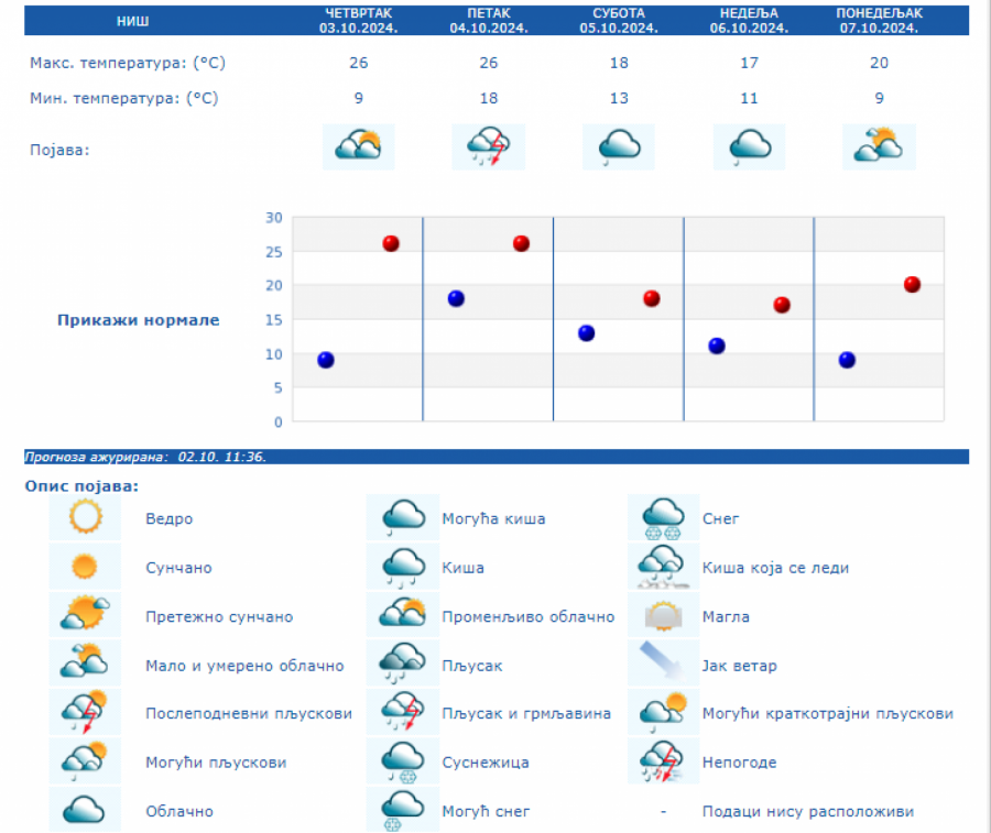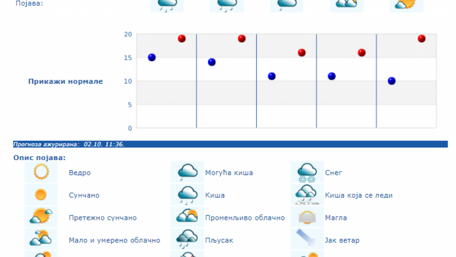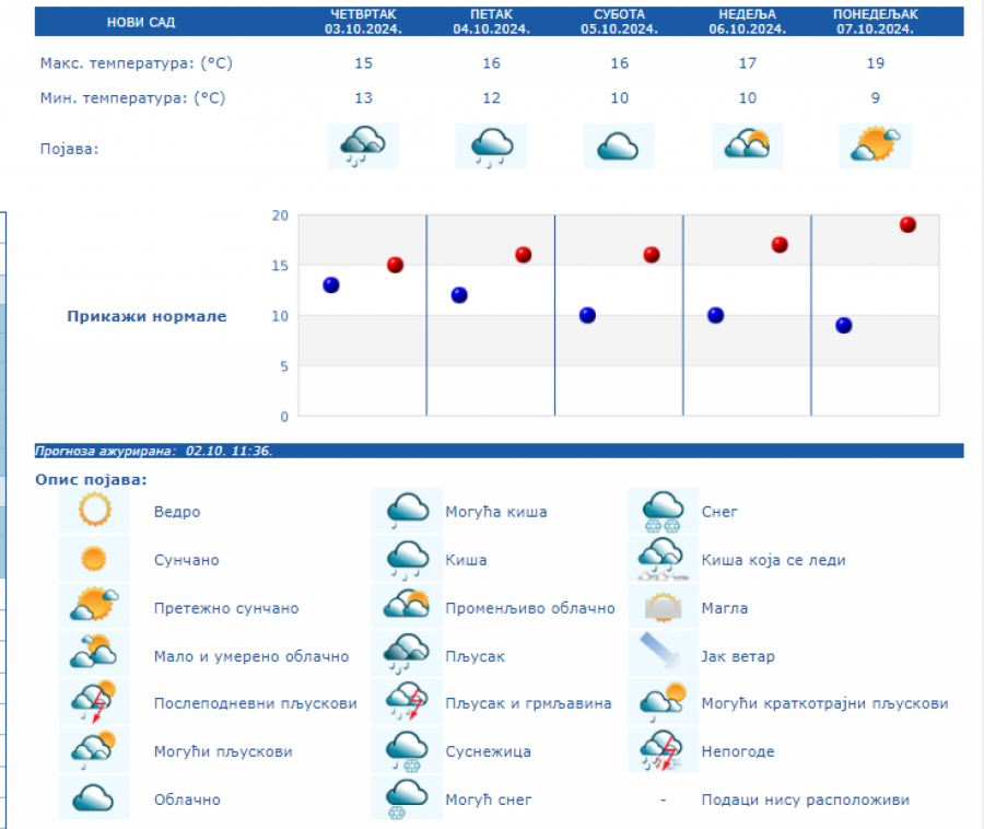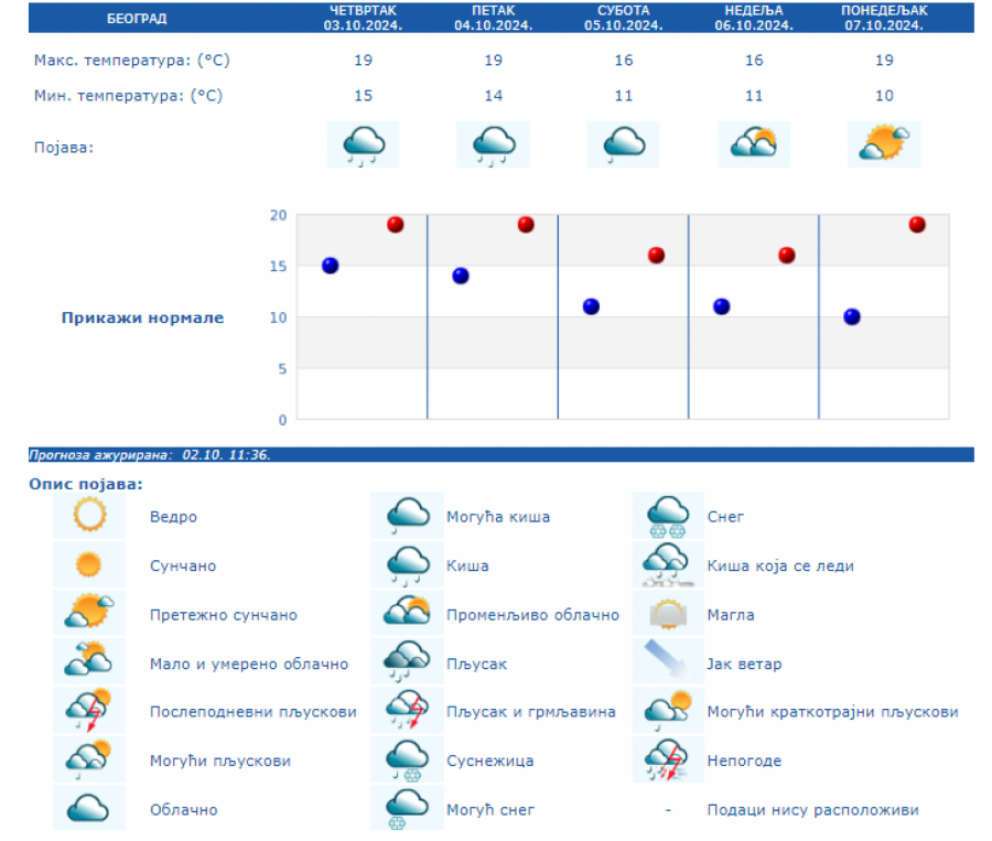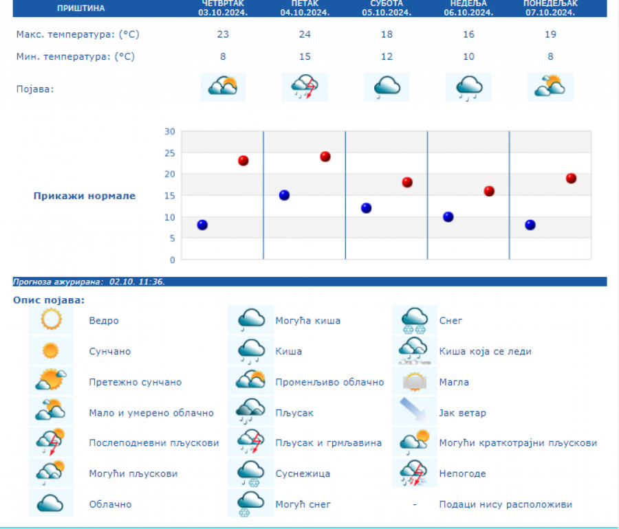 U Srbiji se u petak (04.10.) na severu i zapadu Srbije ujutro očekuje kiša koja će tokom dana prestati. U ostalim krajevima, prema prognozi RHMZ, najavljuje se kiša, pljuskovi i grmljavine, koji će u južnoj, centralnoj i istočnoj Srbiji ponegde biti i izraženiji uz količinu padavina od 20 do 40 mm, a na području AP Kosova i Metohije lokalno i sa više od 60 mm za 24 sata. Na krajnjem jugoistoku padavine će početi tek u petak posle podne, a maksimalna temperatura u ovom delu Srbije ponegde će dostići 30 °C. Istovremeno na severozapadu će biti osetno hladnije (oko 15 °C). Za vikend se očekuje i dalje povremeno kratkotrajna kiša i lokalni pljuskovi, koji će u subotu još ponegde na jugu i jugoistoku biti praćeni grmljavinom, ali se obilne padavine ne očekuju. Početkom naredne sedmice, u ponedeljak i utorak, biće pretežno sunčano uz manji porast dnevnih temperatura, a od srede najavljuje se novo prolazno naoblačenje s kišom.