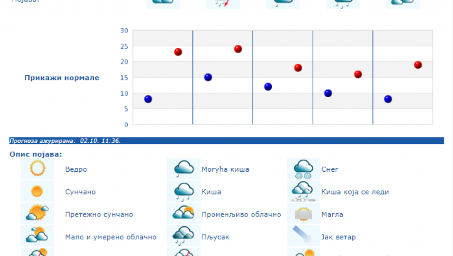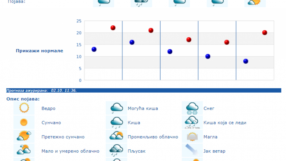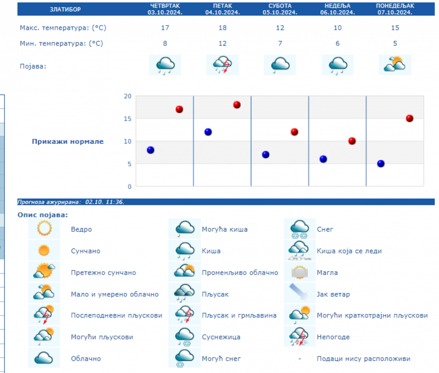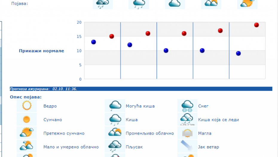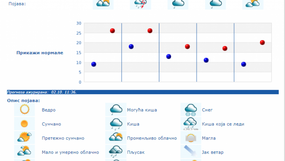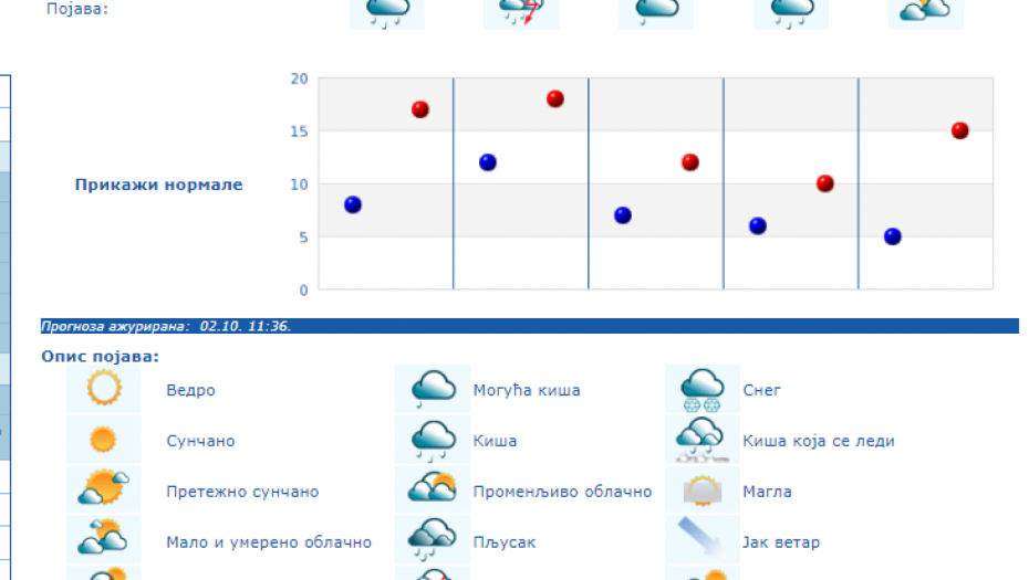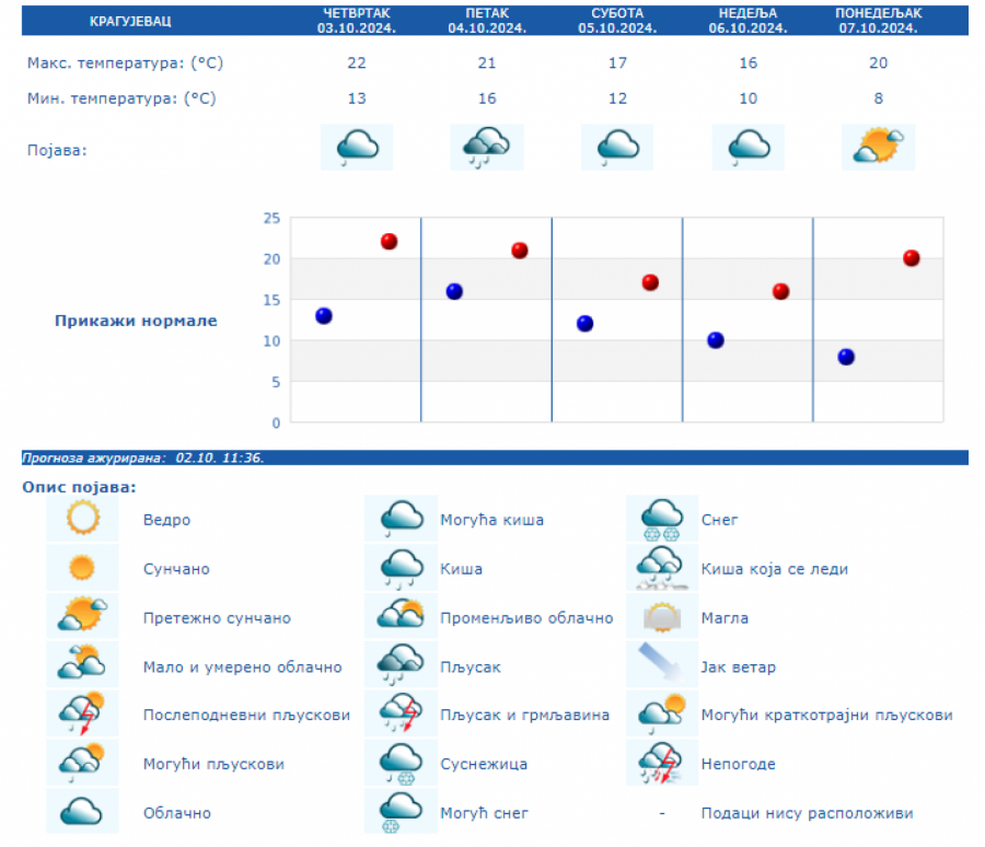 U Srbiji se u petak (04.10.) na severu i zapadu Srbije ujutro očekuje kiša koja će tokom dana prestati. U ostalim krajevima, prema prognozi RHMZ, najavljuje se kiša, pljuskovi i grmljavine, koji će u južnoj, centralnoj i istočnoj Srbiji ponegde biti i izraženiji uz količinu padavina od 20 do 40 mm, a na području AP Kosova i Metohije lokalno i sa više od 60 mm za 24 sata. Na krajnjem jugoistoku padavine će početi tek u petak posle podne, a maksimalna temperatura u ovom delu Srbije ponegde će dostići 30 °C. Istovremeno na severozapadu će biti osetno hladnije (oko 15 °C). Za vikend se očekuje i dalje povremeno kratkotrajna kiša i lokalni pljuskovi, koji će u subotu još ponegde na jugu i jugoistoku biti praćeni grmljavinom, ali se obilne padavine ne očekuju. Početkom naredne sedmice, u ponedeljak i utorak, biće pretežno sunčano uz manji porast dnevnih temperatura, a od srede najavljuje se novo prolazno naoblačenje s kišom.