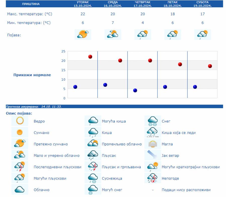 U Ap Kosovu i Metohiji ujutru je moguća lokalna pojava magle, dok će u toku dana biti pretežno sunčano vreme sa temperaturama do 23 stepena.