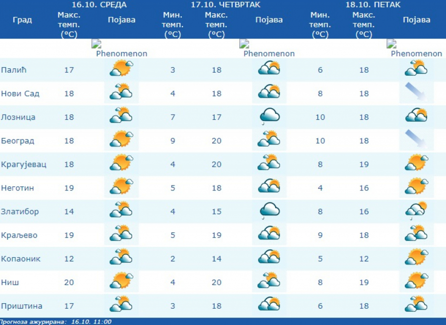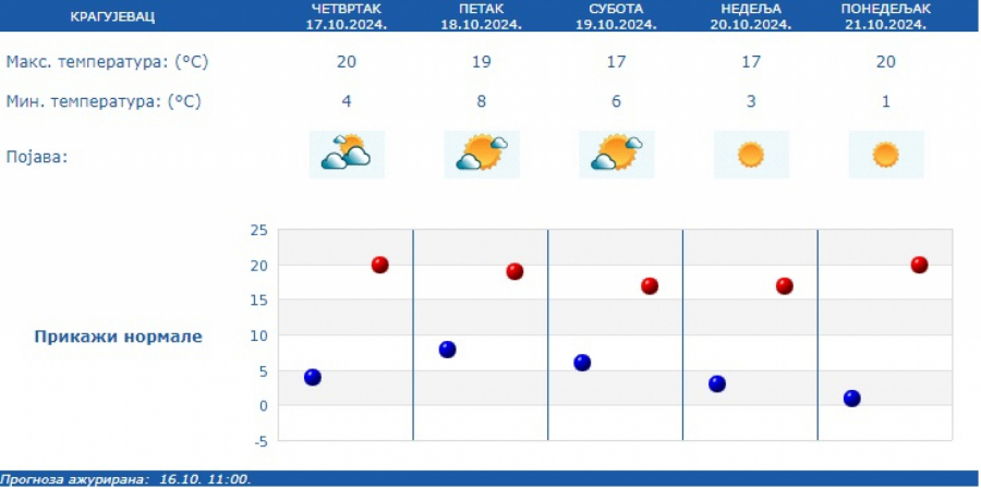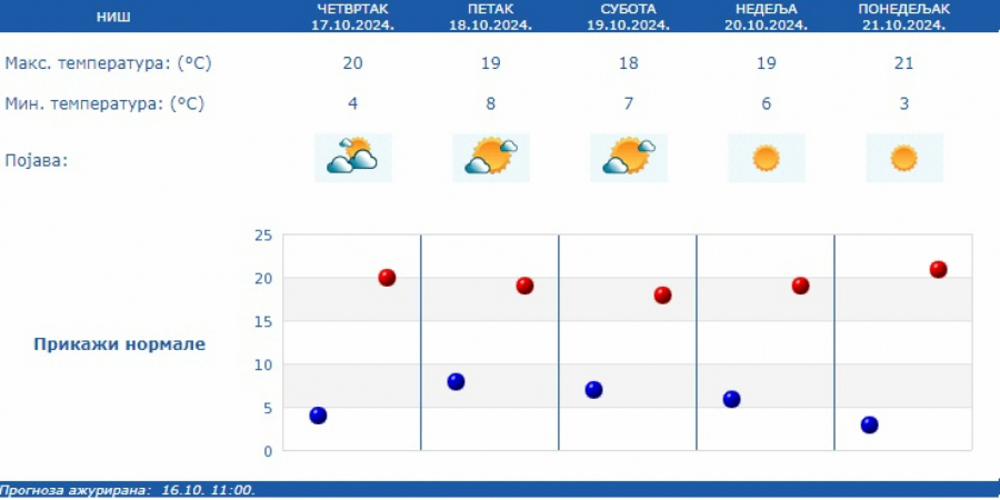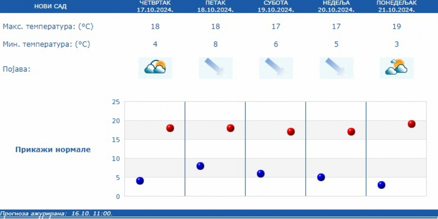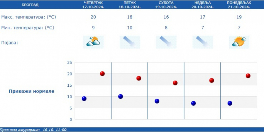 Kako se navodi, u narednom periodu se u Srbiji nastavlja period suvog vremena sa temperaturom u granicama proseka za drugu polovinu oktobra, u većini mesta od 16 do 21 stepen, samo se očekuje umeren i jak vetar do kraja nedelje, na jugu Banata povremeno i olujni jugoistočni vetar.