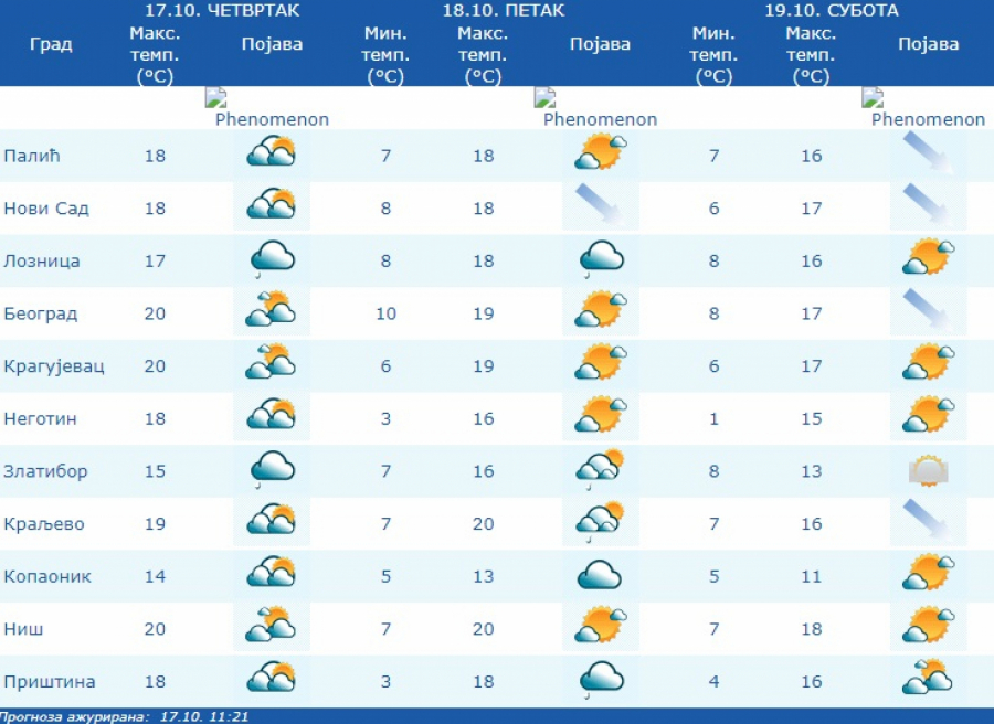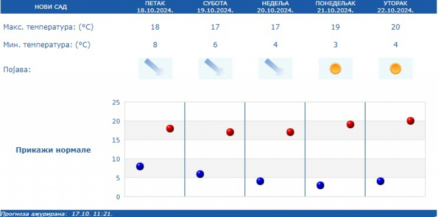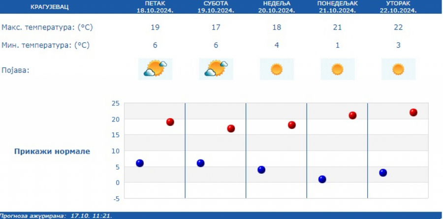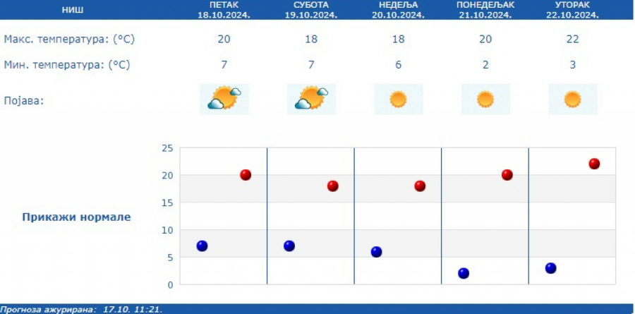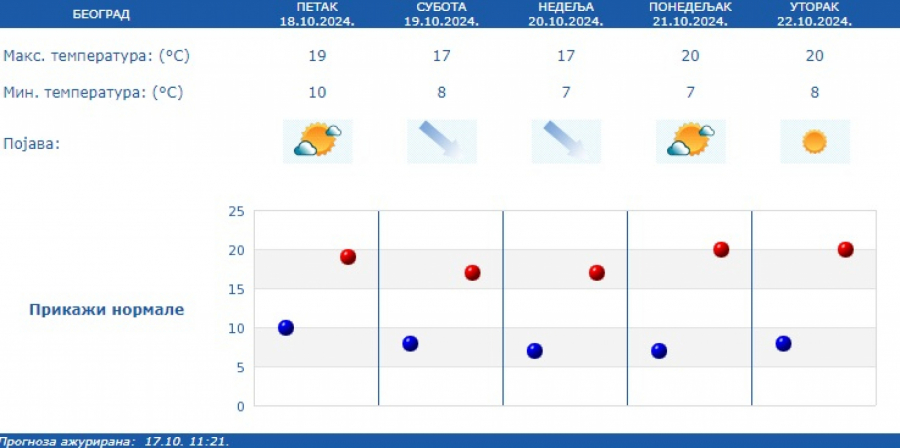 Prema prognozi za narednih sedam dana, nastavlja se period suvog vremena sa temperaturom u granicama proseka za drugu polovinu oktobra, u većini mesta od 16 stepeni do 22 stepena.