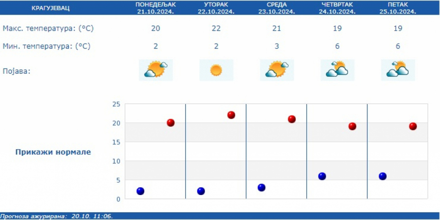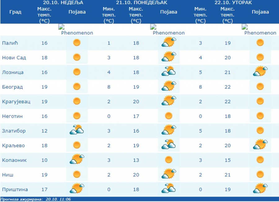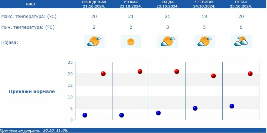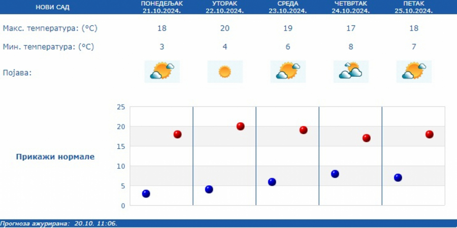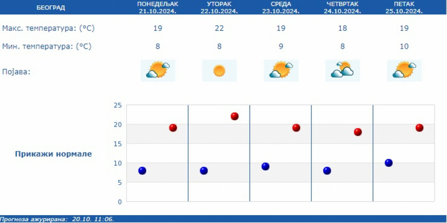 Prema prognozi za narednih sedam dana, jutra će biti hladna, sa pojavom slabog prizemnog mraza, a početkom naredne sedmice na jugu i istoku Srbije ponegde i sa slabim mrazom na dva metra visine, kao i po kotlinama u brdsko-planinskom području.