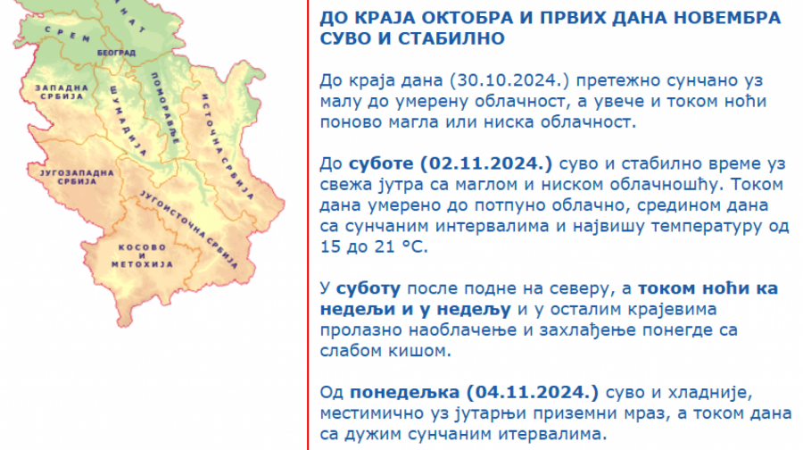 Od ponedeljka suvo i hladnije, mestimično uz jutarnji prizemni mraz, a tokom dana sa dužim sunčanim itervalima, navodi se u prognozi RHMZ.