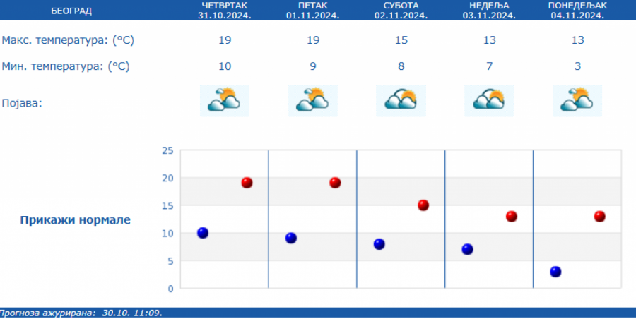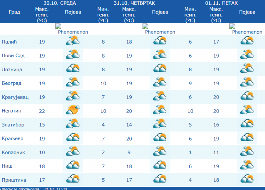 Duvaće vetar slab, zapadni i severozapadni. Najniža temperatura biće od 8 do 10 stepeni, najviša dnevna oko 19 stepeni. U toku noći ponovo se očekuje pojava magle ili niske oblačnosti.
