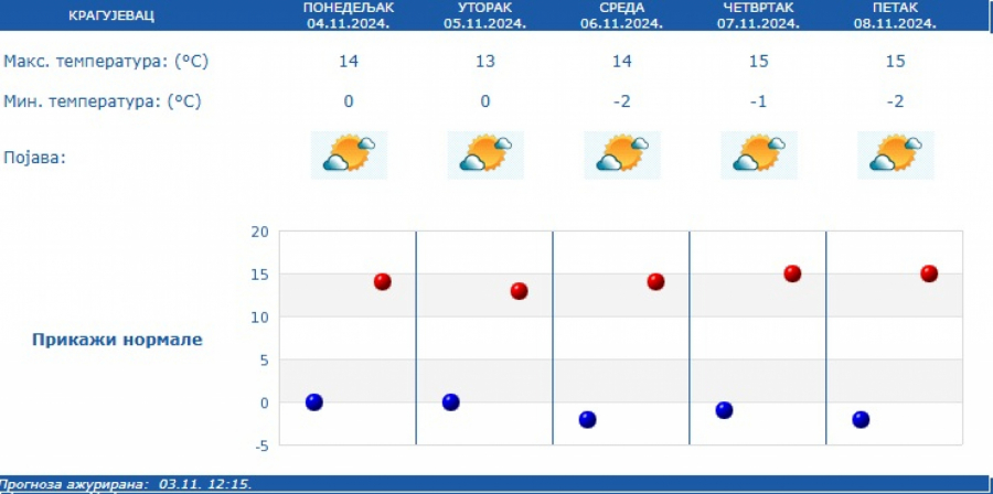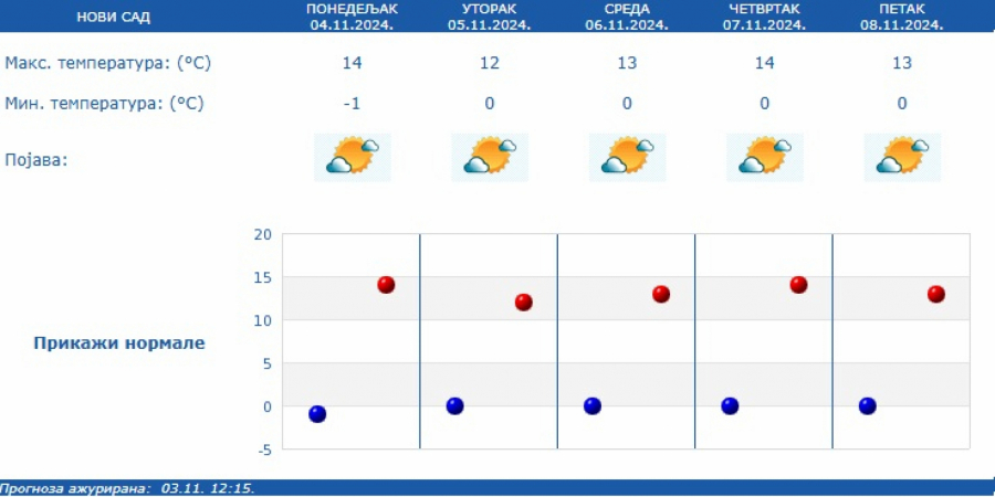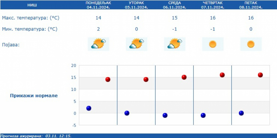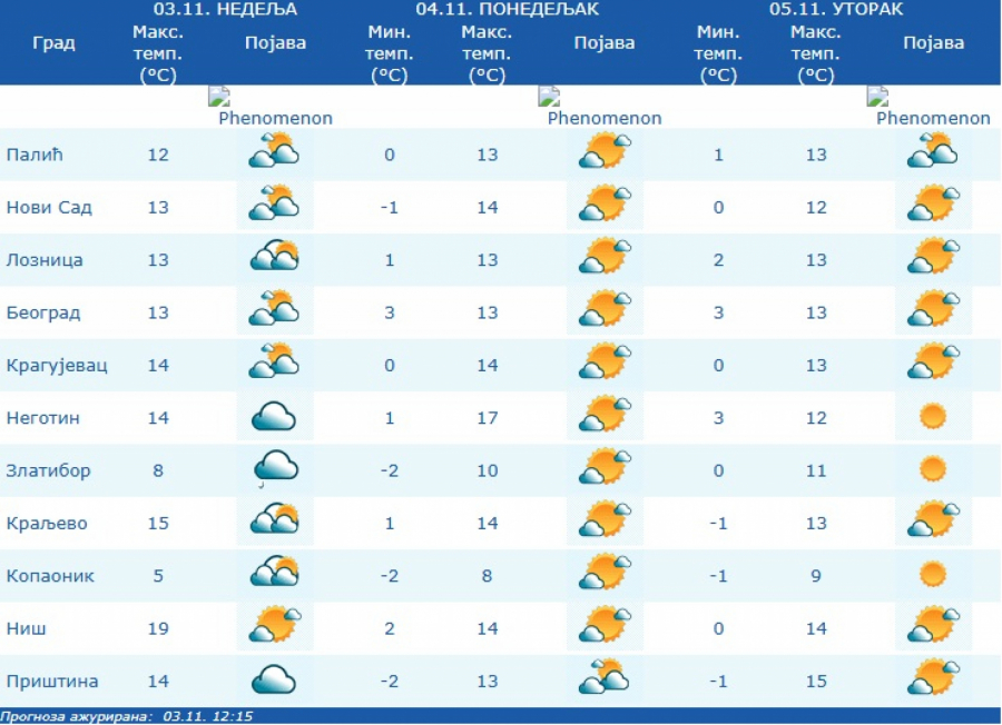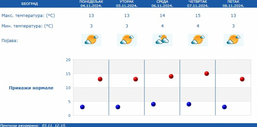 Najniža temperatura biće od -2 do 3 stepeni, najviša dnevna od 12 do 17.