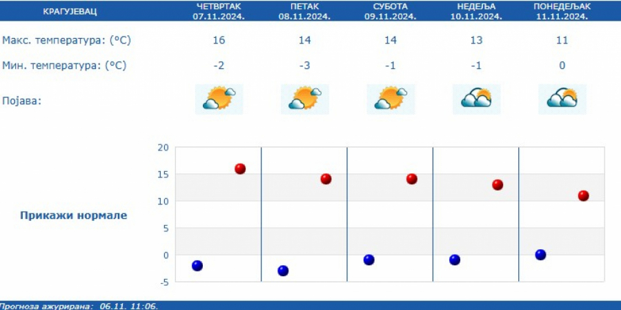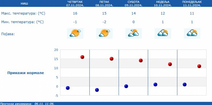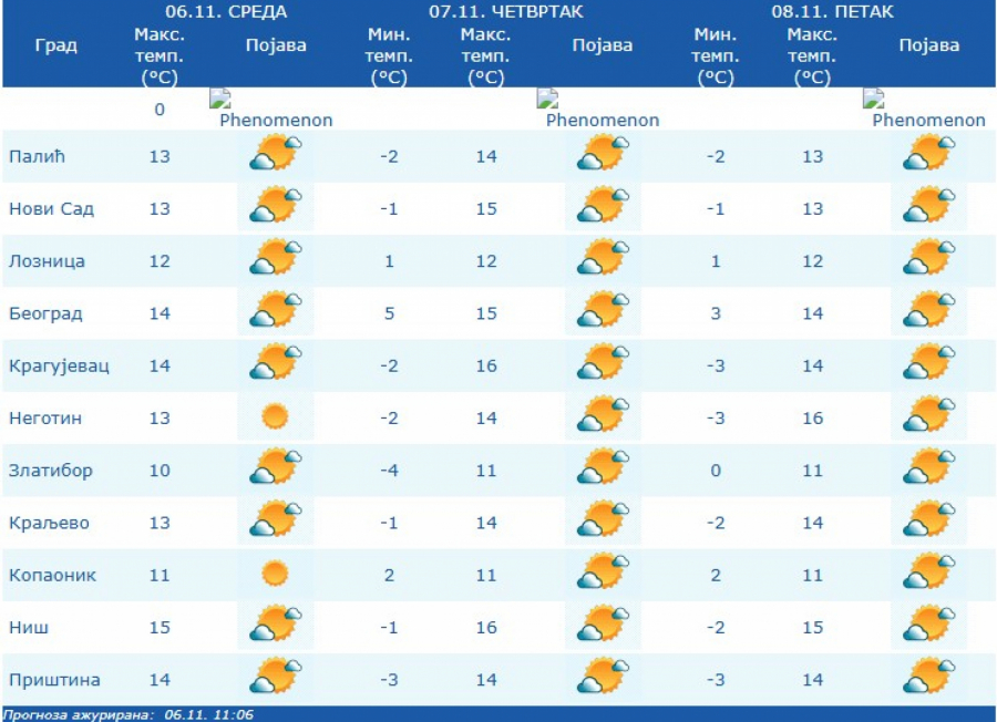 U petak i subotu pretežno sunčano sa dnevnom temperaturom od 11 do 17 stepeni, koja će u nedelju na severu i zapadu, a početkom naredne sedmice i u ostalim predelima biti u postepenom padu na vrednosti od 8 do 13 stepeni.