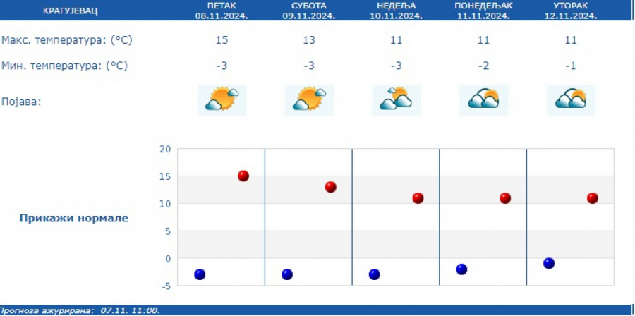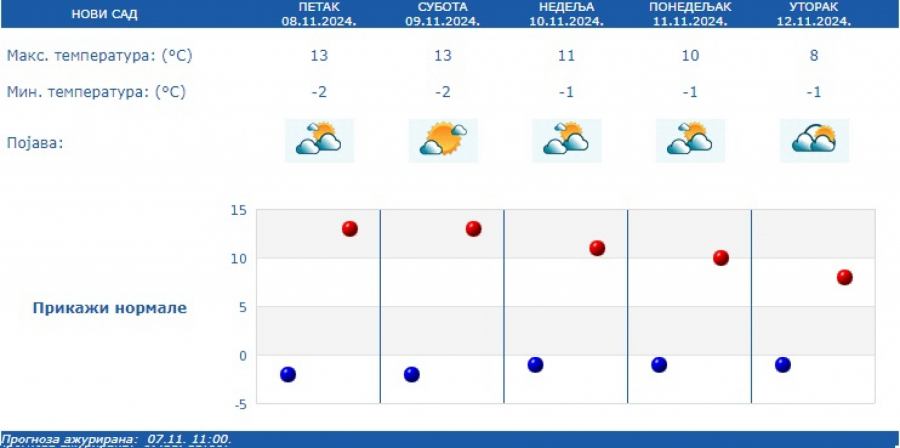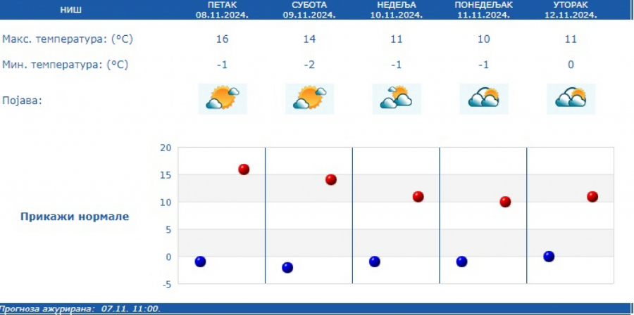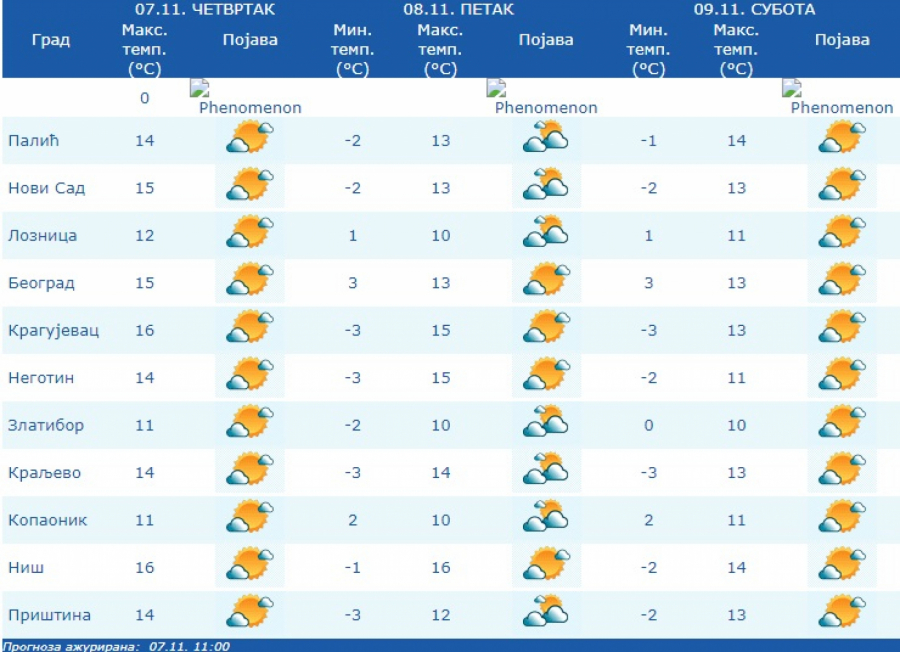 U Beogradu se ujutru na širem području grada očekuje slab mraz, a tokom dana pretežno sunčano uz slab i umeren razvoj dnevne oblačnosti, slab, istočni i jugoistočni vetar i najvišu dnevnu temperaturu oko 14 stepeni.