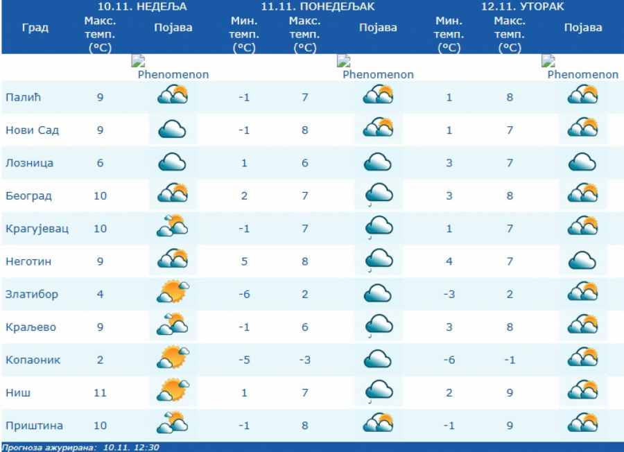 Na severu pre podne i sredinom dana sa sunčanim intervalima, a u ostalim krajevima mestimično sa kišom, na najvišim planinama moguće je provejavanje slabog snega, saopštio je RHMZ.
