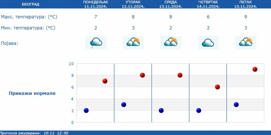 U Beogradu će vreme u toku dana biti umereno do potpuno oblačno, posle podne i uveče sa kratkotrajnom kišom i najvišom dnevnom temperaturom oko sedam stepeni.