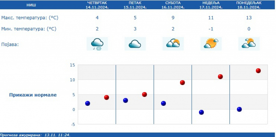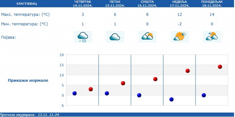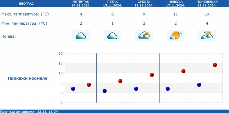 Što se tiče izgleda vremena u Srbiji za narednih sedam dana, u petak će biti oblačno i hladno, ponegde sa slabom kišom ili susnežicom, a u brdsko-planinskim predelima sa slabim snegom.