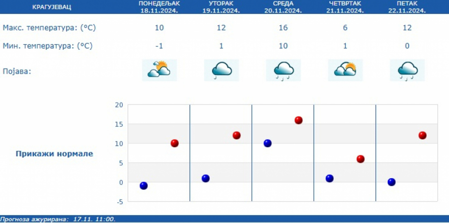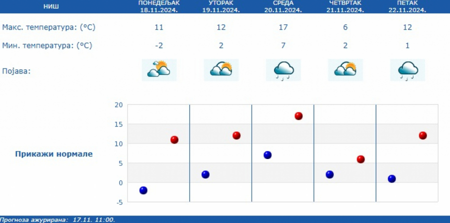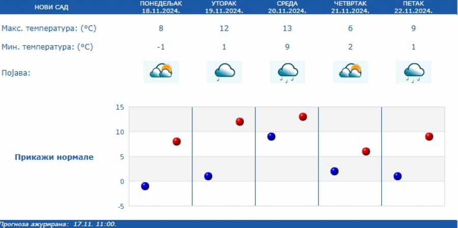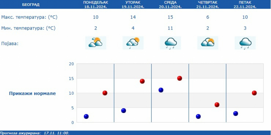 Kad je reč o izgledima vremena u Srbiji za narednih sedam dana, do subote će biti promenljivo vreme sa čestim temperaturnim oscilacijama i prolaznim naoblačenjima u nižim predelima sa kišom, susnežicom i snegom, a u brdsko-planinskim predelima sa snegom uz formiranje manjeg snežnog pokrivača.