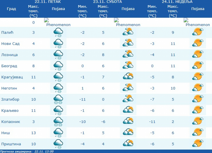 Od jutra očekuje se slab mraz, u većini krajeva umereno, a na krajnjem jugu i jugoistoku Srbije i potpuno oblačno vreme uz provejavanje slabog snega. Pre podne i sredinom dana postepeno razvedravanje.