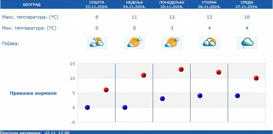 Tokom dana biće pretežno sunčano i toplije. U drugoj polovini sledeće nedelje uslediće postepeni pad temperature i povećanje oblačnosti, a mestimično se očekuje i kiša, u brdsko-planinskim predelima sneg, navodi se u vremenskoj prognozi RHMZ.
