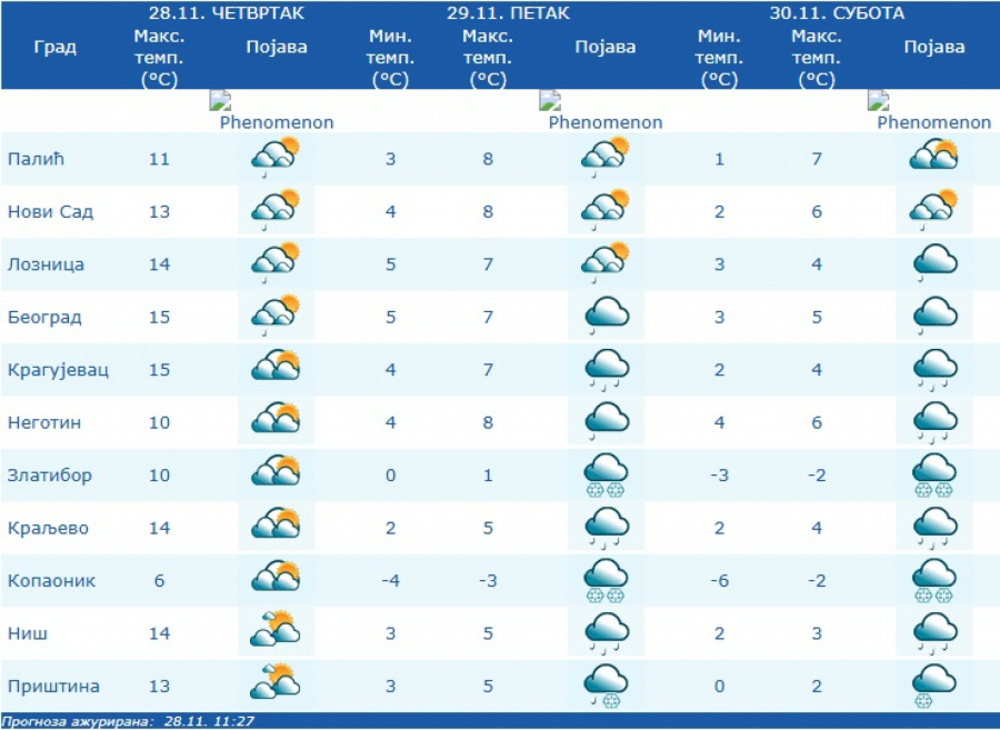 U nižim predelima padaće uglavnom kiša, na jugozapadu, jugu i jugoistoku ponegde susnežica i sneg, a u brdsko-planinskim predelima sneg uz dalje povećanje visine snežnog pokrivača.