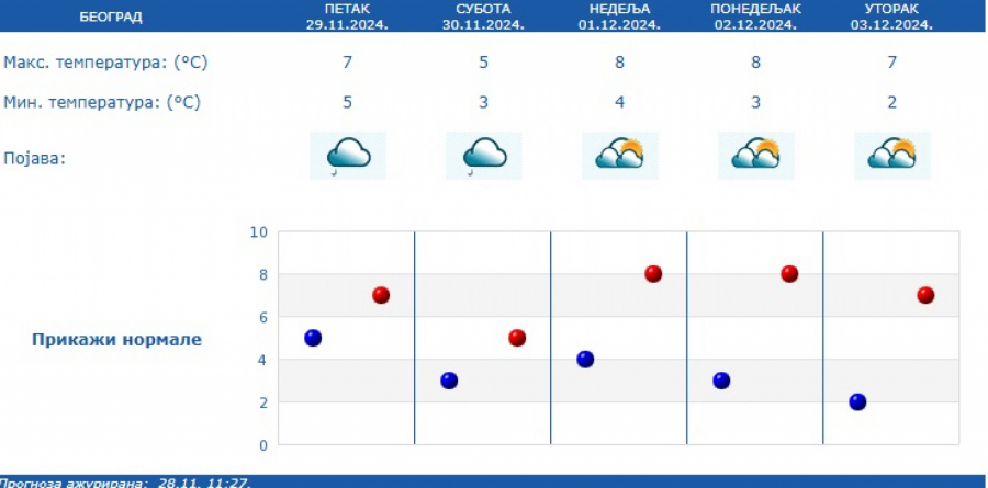 Za vikend će u Srbiji biti pretežno oblačno. U subotu padavine se očekuju u većem delu zemlje, a u nedelju u predelima južnije od Save i Dunava, dok će na severu biti kratkotrajnih sunčanih intervala.