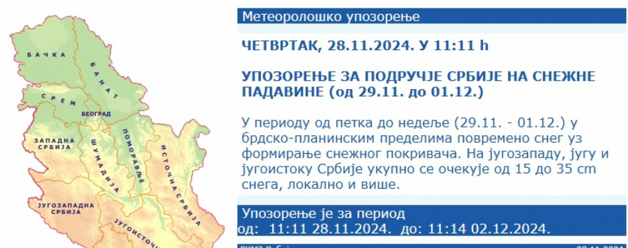 Na jugozapadu, jugu i jugoistoku Srbije ukupno se očekuje od 15 do 35 centimetara snega, lokalno i više, kaže se u upozorenju na snežne padavine Republičkog hidrometeorološkog zavoda (RHMZ).