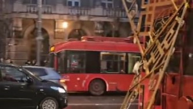 Na društvenim mrežama objavljena je fotografija, ali i snimak na kojima se vidi kako deo rasvete visi na trolejbusu, a segmenti se nalaze i na zemlji.