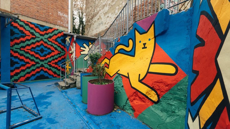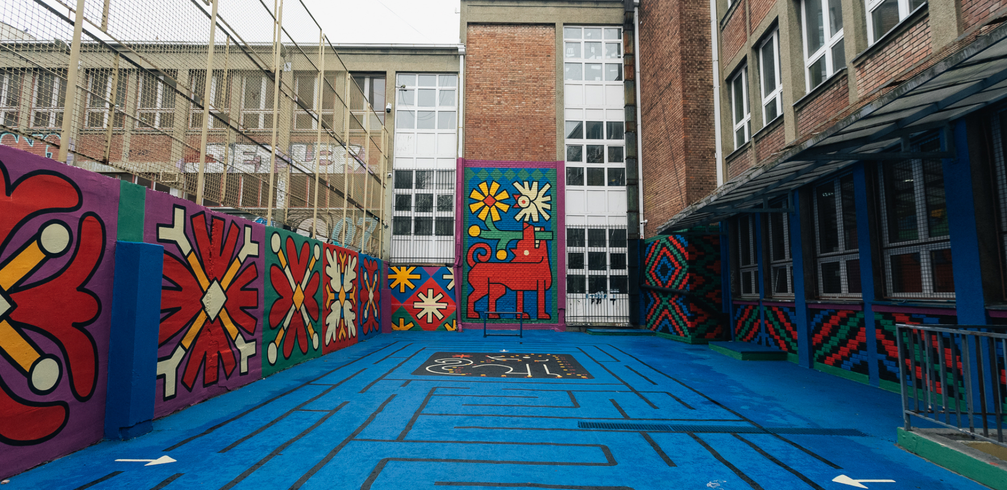 Mural u „Skadarliji“ spaja zidove i pod u harmoničnu celinu, oslikavajući igru kao osnovni motiv. Pored estetske vrednosti, delo je i interaktivno budući da je njegov centralni deo, lavirint oslikan na podu, kroz koji deca prolaze tražeći put do centra. U središtu lavirinta nalazi se crtež koji učenici sami mogu da dovrše, podstičući tako njihovu kreativnost i osećaj pripadnosti.