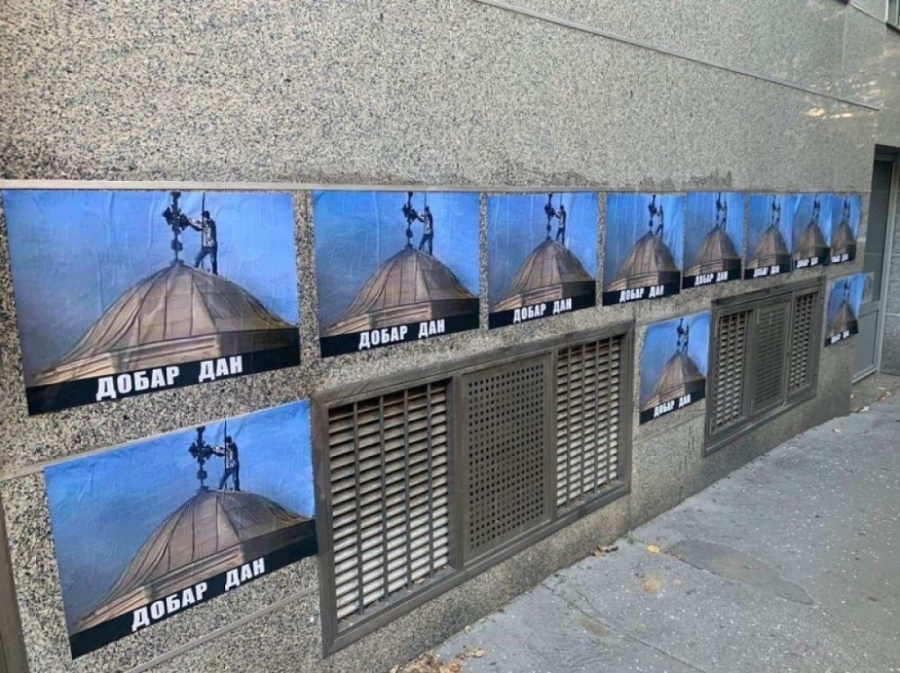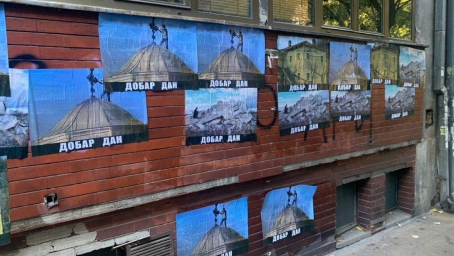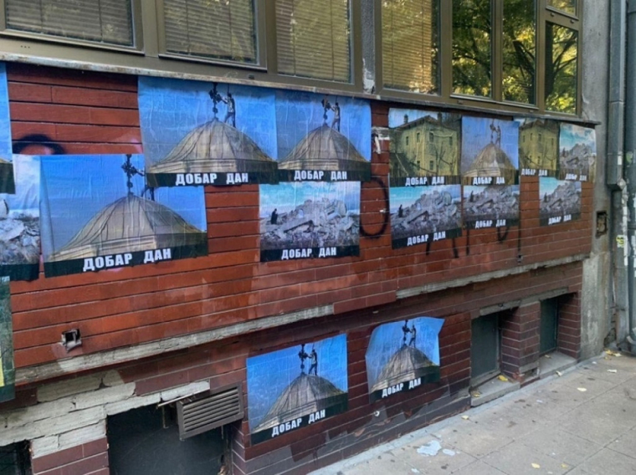 Fotografije Albanca koji je tokom martovskog pogroma 2004. godine divljački polomio, a potom bacio krst sa Crkve Svetog Ilije u Podujevu, zalepljene su na zidove i vrata Centra za kulturnu dekontaminaciju gde danas počinje festival "Mirdita, dobar dan".
