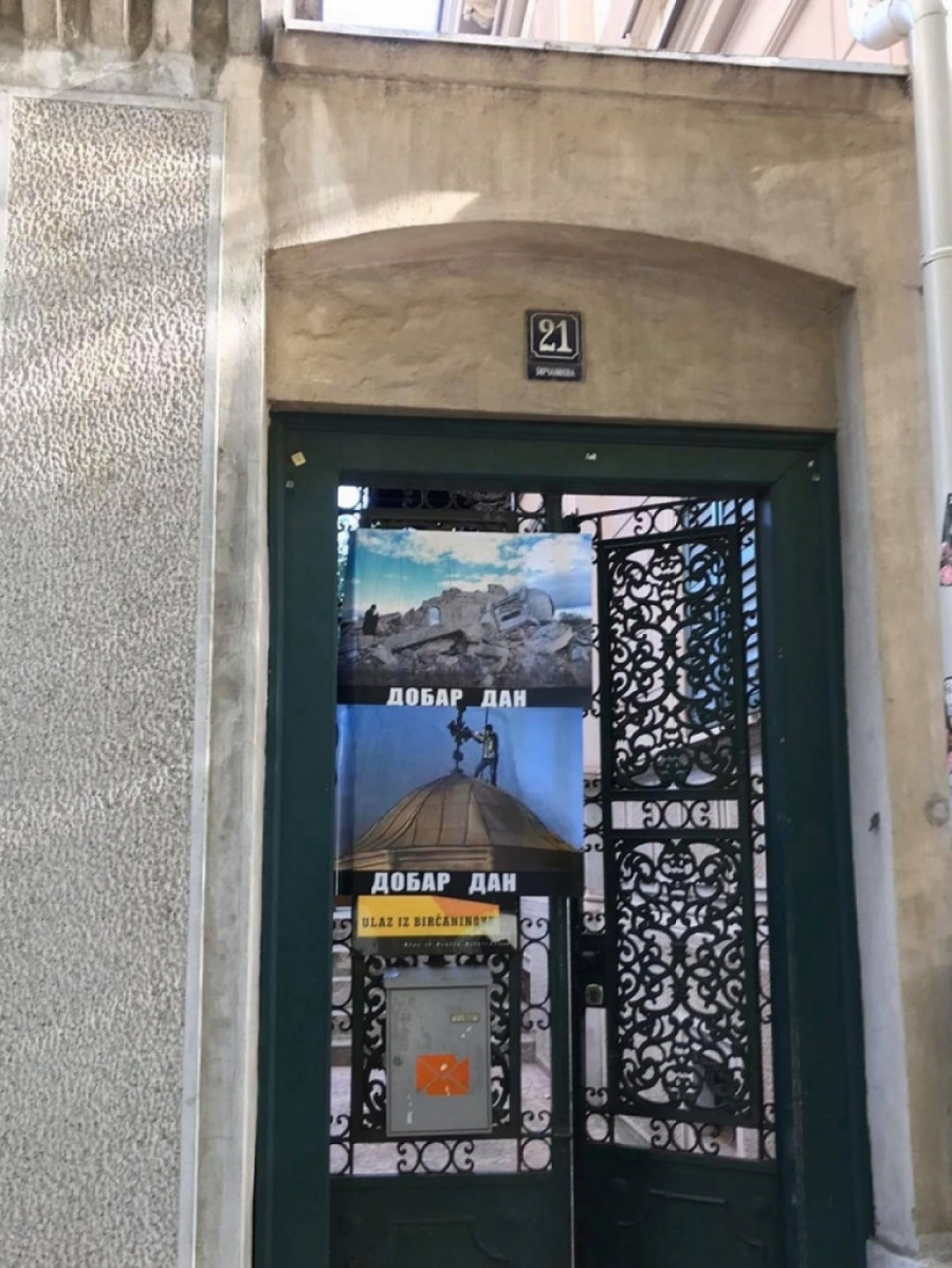 Ispod fotografija vandalskog rušenja crkve, ozloglašene Žute kuće i monaha koji sedi kraj ruševina manastira, napisana je samo kratka poruka "Dobar dan".