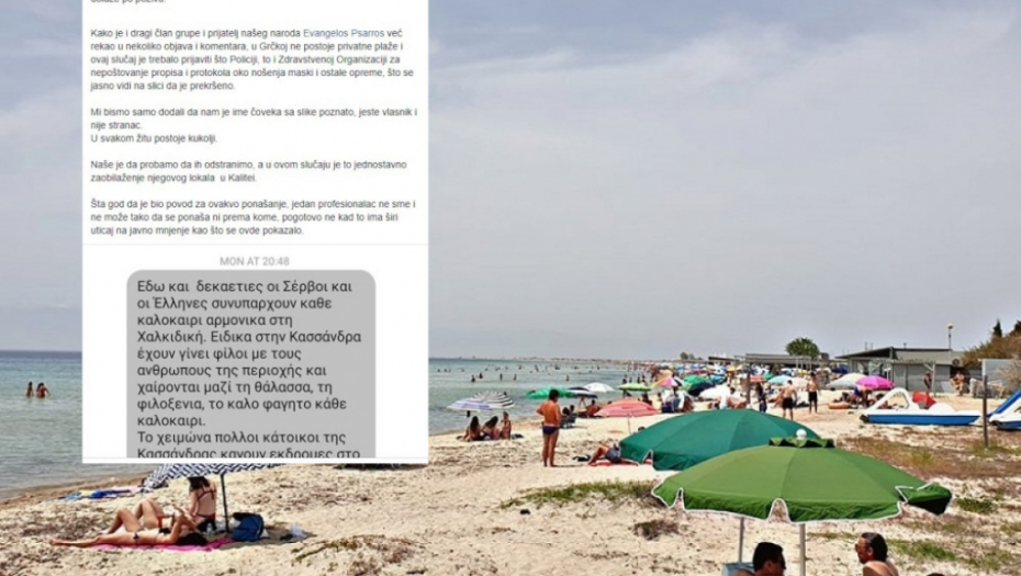 - Ime ne možemo da objavimo jer nismo poslali nikakav zvaničan dopis, ali smo dobili obaveštenje da svako ko želi može to učiniti ili u Poligirosu u Upravi Periferije ili u Opštinama svake pojedinačne regije Halkidikija. Takođe, savet je da svaku nepravilnost ili problem koji imate prijavite odmah Turističkoj Policiji Halkidikija, a mi potvrđujemo da su revnosni i da brzo dolaze po pozivu. Kako je i dragi član grupe i prijatelj našeg naroda Evangelos Psarros već rekao u nekoliko objava i komentara, u Grčkoj ne postoje privatne plaže i ovaj slučaj je trebalo prijaviti što policiji, to i zdravstvenoj organizaciji za nepoštovanje propisa i protokola oko nošenja maski i ostale opreme, što se jasno vidi na slici da je prekršeno. Mi bismo samo dodali da nam je ime čoveka sa slike poznato, jeste vlasnik i nije stranac. U svakom žitu postoje kukolji. Naše je da probamo da ih odstranimo, a u ovom slučaju je to jednostavno zaobilaženje njegovog lokala u Kalitei. Šta god da je bio povod za ovakvo ponašanje, jedan profesionalac ne sme i ne može tako da se ponaša ni prema kome, pogotovo ne kad to ima širi uticaj na javno mnjenje kao što se ovde pokazalo - stoji na kraju objave u grupi Live from Greece.