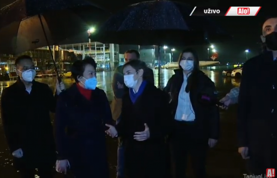Pošiljku iz Kine, na aerodromu Nikola Tesla, dočekuje premijerka Srbije Ana Brnabić i ambasadorka NR Kine Čen Bo.