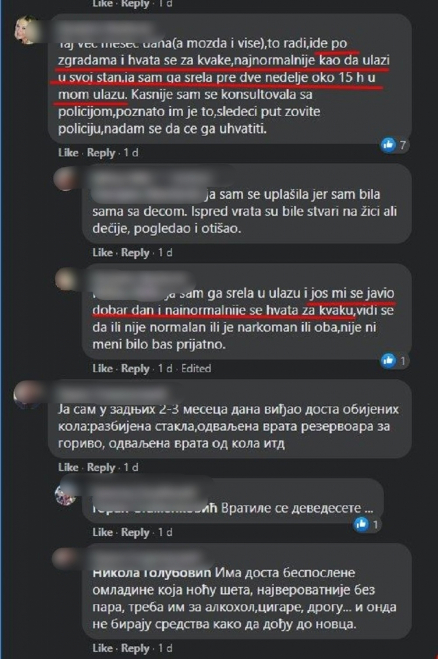 Na društvenoj mreži Fejsbuk u grupi zatvorenog tipa, oglasile su se zabrnute komšije i svi zajedno posvedočili su to da su u holu svoje zgrade videli mušku osobu koja uporno pokušava da uđe u nečiji stan.