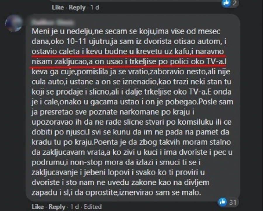 "Meni je u nedelju,ne sećam se koju, ima više od mesec dana, oko 10-11 ujutru, ja sam iz dvorišta otišao autom, i ostavio oca i majku budne u krevetu uz kafu i naravno nisam zaključao, a on ušao i trkeljiše po polici oko TV-a. Majka ga čuje, pomislila ja se vratio, zaboravio nešto, ali nije čula auto i ustane, a on se iznenadio, kao traži neki stan tu koji se prodaje i slično, ali i dalje trkeljiše oko TV-a. E onda je i otac, onako u gaćama ustao i on je pobegao. Posle sam ja presretao sve poznate narkomane po kraju i upozoravao ih da ne rade slične stvari po komšiluku ili ce dobiti po njušci. I svi se kunu da im ne pada na pamet da kradu tu po kraju. Poenta je da zbog takvih moram stalno da zaključavam vrata, a ko živi u kući i ima dvorište i peć u podrumu, i non-stop mora da izlazi i smuci ti se i zakljucavanje..." navodi se u objavi.