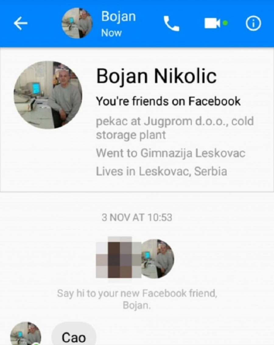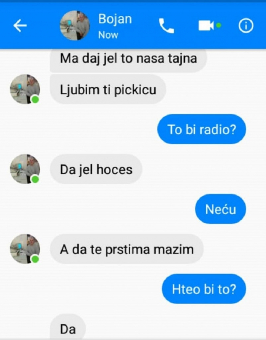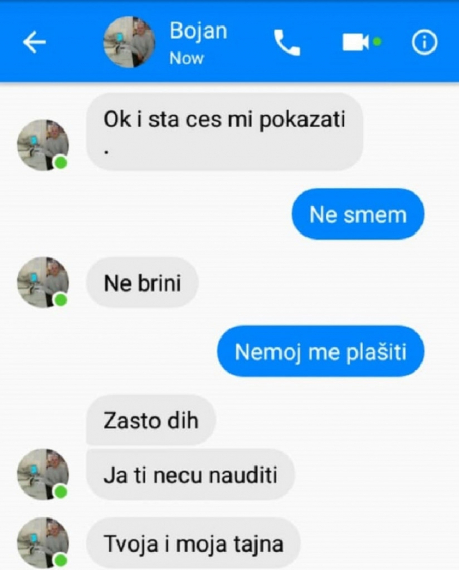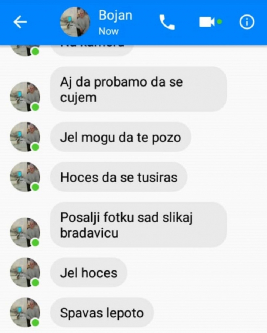 U Fejsbuk grupi "Stop pedofiliji" objavljena je stravična prepiska s predatorom Bojanom Nikolićem iz Leskovca iz Zaječara, koji je navodnoj devojčici od 13 godina slao gnusne poruke, fotografije i ubeđivao je da se sa njim dopisuje na vrlo eksplicitan način, kao i da se snima tokom tuširanja ne bi li on gledao.