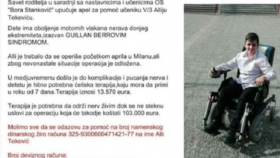 - Njegova škola je pomogla. Skupili su novac. 10 000 evra za nedelju dana. Svi su učestvovali. Svaki đak i zaposleni. I sakupili su.