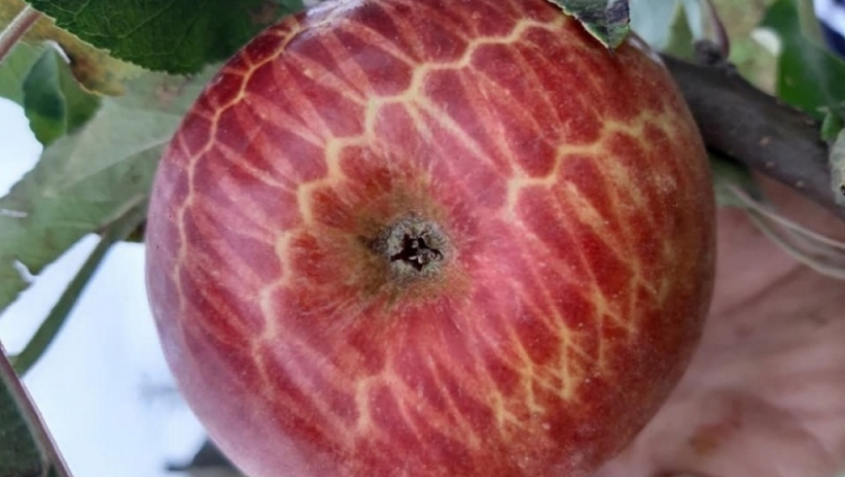 „Imam mlad zasad jabuke koji je sada u četvrtoj godini, gusta sadnja. Na dva stabla bio je po jedan plod, kada sam ubrao jabuku baš sam se iznenadio. Jabuka je porasla i sazrela u mrežici koja je postavljena da bi zaštitila stablo od glodara, tako da je na plodu ostala šara od mreže“, kaže Dejan Marković iz sela Bor.
