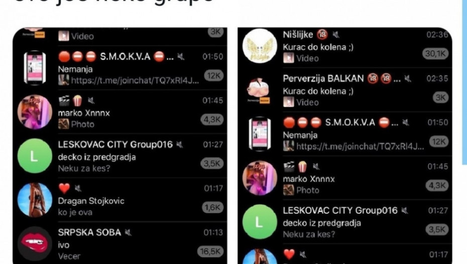 "Ja sam pre godinu dana saznala za grupu jer se moj instagram profil provlačio po njoj, tražili su moje gole slike i snimke. Tek sada sam se dočepala svih grupa, učlanila se u njih sa lažnih profila i sve skrinšotovala. Naravno, ne mogu sve, jer slike i snimci nedužnih devojaka, pa čak i dece, stižu nenormalno brzo", ispričala je Staša.