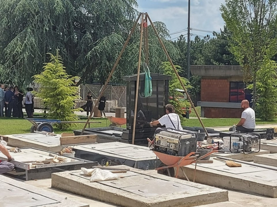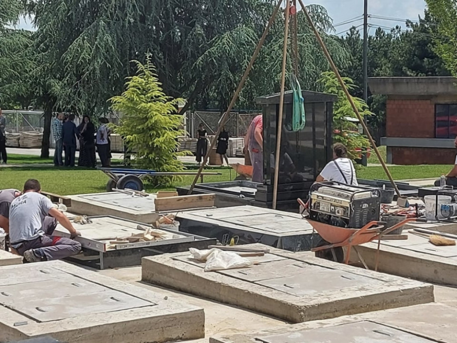 U blizini kapale, 30ak metara, građevinski radovi na groblju nisu stali, kamenoresci obavljaju svoje redovne poslove -montiraju grobnicu, spomenik, ali malter mešaju ručno, iskljucili su električnu mešalicu da malter kako ne bi stvarali buku.