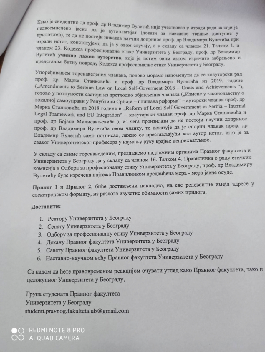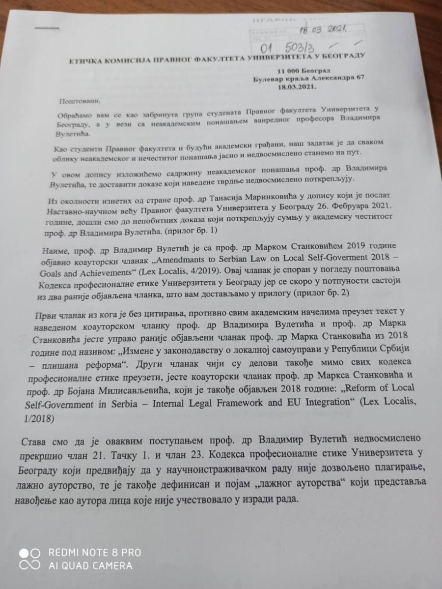 Studenti u obrazloženju prijave navode da se Vladimir Vuletić prilikom objavljivanja naučnog rada u koautorstvu sa profesorom doktorom Markom Stankovićem nije pridržavao etičkog kodeksa.