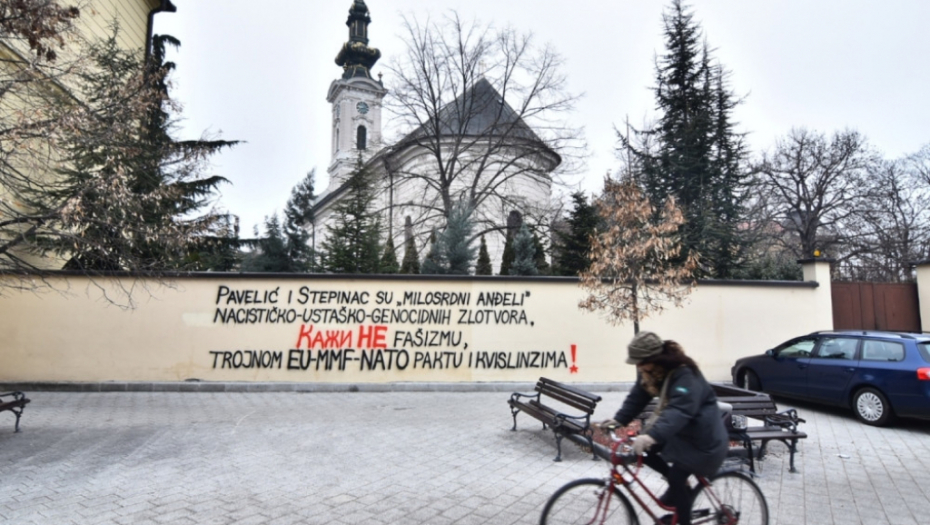 Velikim slovima na zidu Vladičanskog dvora ispisano je "Pavelić i Stepinac su "milosrdni anđeli" nacističko-ustaško-genocidnih zlotvora, kaži ne fašizmu, trojnom EU-MMF-NATO paktu i kvislinzima", sa znakom uzvika i zvezdom petokrakom na kraju.