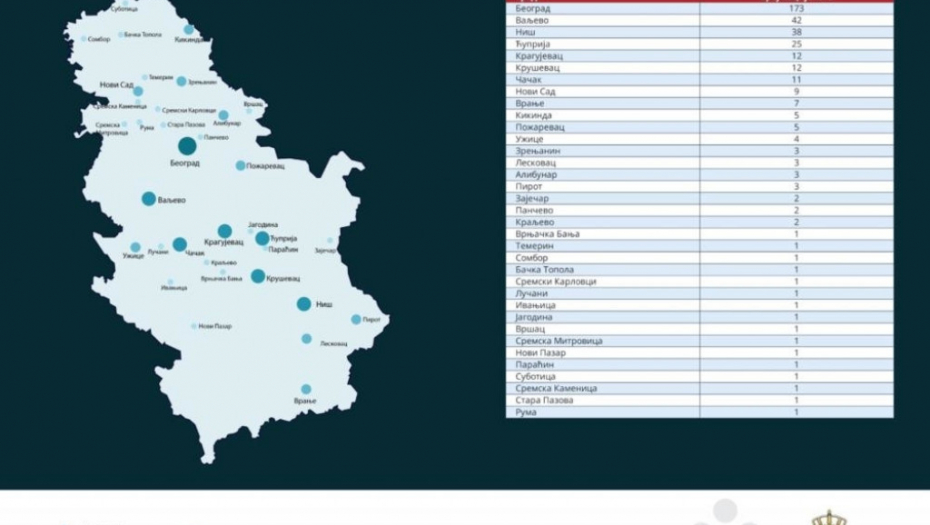 Na četvrtom mestu je Novi Sad (169), potom slede Kruševac (84) i Valjevo (82) te Leskovac (76), Zaječar (59) i Vranje (57). U Kikindi, mestu gde je korona prvi put zabeležan u Srbiji, trenutno je 13 obolelih. Veliki broj mesta ima po jednog zaraženog stanovnika.