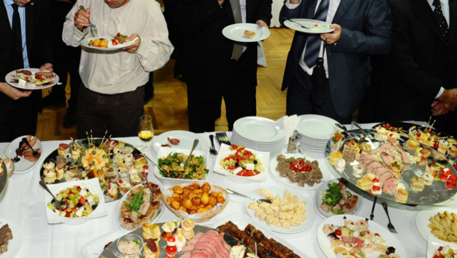 Uz hladno predjelo uvek ide toplo glavno jelo, a da neko u Nacionalnoj službi za zapošljavanje zaista ima ukusa, potvrđuje to što je izbor pao na teleće pečenje ispod sača, jagnjeće kotlete, piletinu sa povrćem, dok će za one koji poste biti spremljena riba. Kada tako fino napune stomake, mogu da biraju čime će se zasladiti, jer je u ponudi više različitih slatkiša, voćne i čokoladne torte, slatke pite i kolači. Sokovi, voda i više vrsta kafe u neograničenim količinama se, naravno, podrazumevaju. Možda u NSZ-u ne znaju baš uvek kako da pronađu posao nekome od 750.000 nezaposlenih ljudi, ali kada je organizacija fešti u pitanju, baš imaju šlifa.