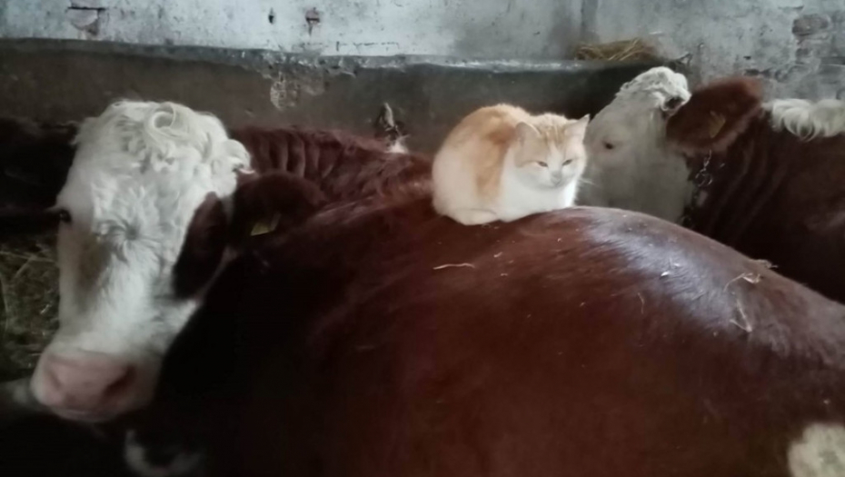 „Dobili smo steone junice preko naše zadruge iz Vojkovaca. Čim smo ih smestili u objekat mačka je prišla Ruži i legla na nju. Od tad pa evo svih ovih dana kada god uđemo u štalu ona leži na njoj, ako krava jede i pomera se, mačka stoji pored i posmatra je, čim se krava spusti da legne mačka dolazi i penje se njoj na leđa i tako svaki dan“, priča nam domaćin Bojan Mijailović.