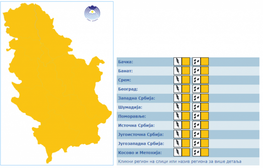 U narednih sat vremena (do 22.41) na području donjeg Podrinja, jugozapadne Srbije očekuje se mestimično kiša i lokalni plјuskovi sa grmlјavinom, te je na snazi žuti meteoalarm, dok će sutra biti narandžasti.