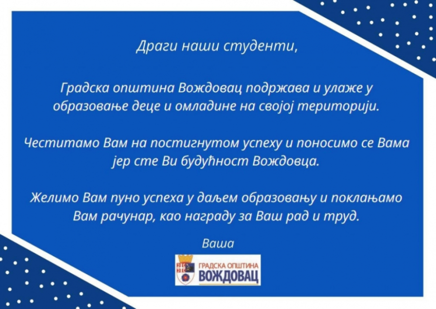 - Mi kao Opština podržavamo i ulažemo u ono što je najvrednije, a to ste vi. Čestitamo vam na postignutom uspehu. Ponosimo se vama jer ste vi naša budućnost. Poklanjamo vam laptop računare, kao mali znak pažnje i želje da budete što bolji i uspešniji u daljem obrazovanju - rekla je predsednica Opštine Ivana Tomić Ilić.