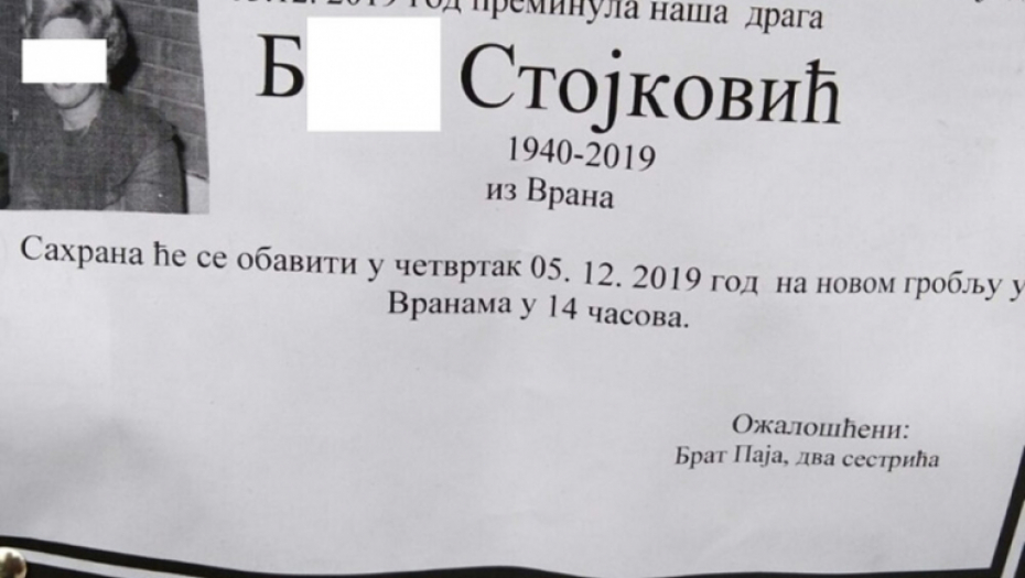 Na oglasnim tablama i banderama u Arilju pre dva dana osvanula je umrlica na kojoj se komšije, prijatelji i rodbina obaveštavaju da je ovaj svet napustila B. Stojković iz sela Vrana.